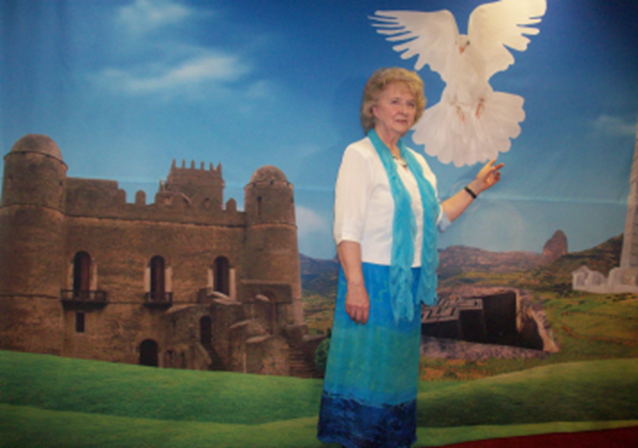 Helen on Ethiopian Christian TV, pointing to a painting on the studio-wall  depicting a view from that country and the Dove of the Holy Spirit flying over.